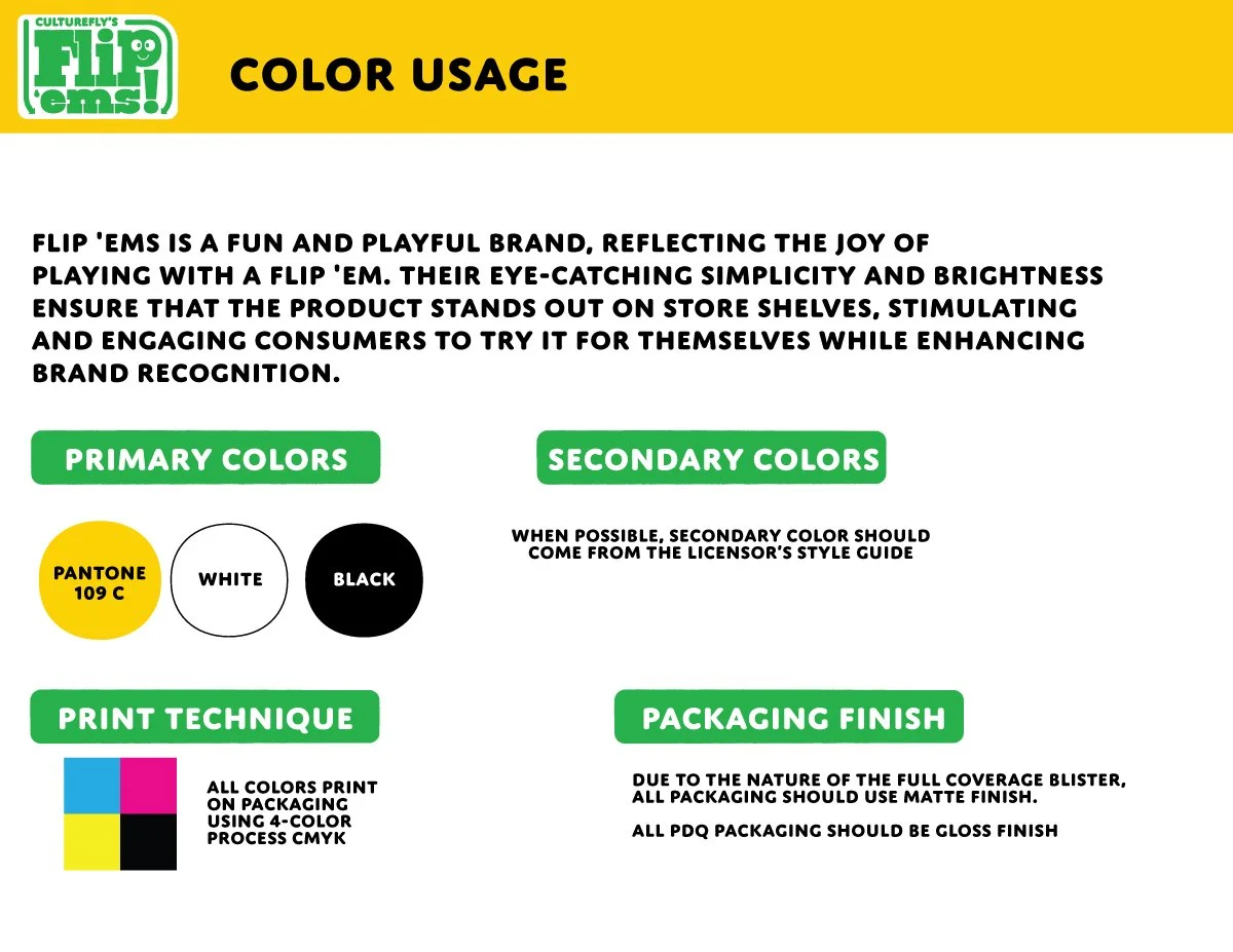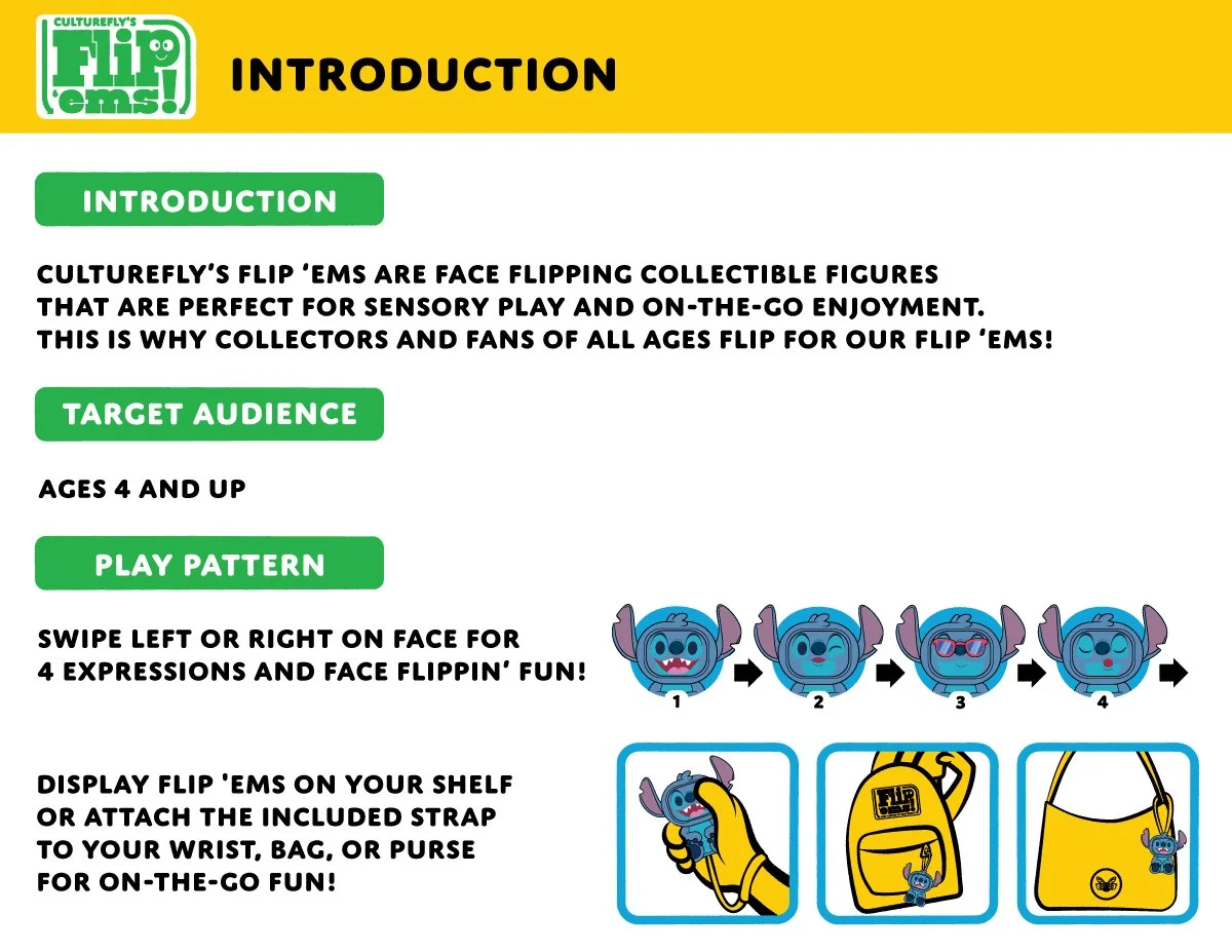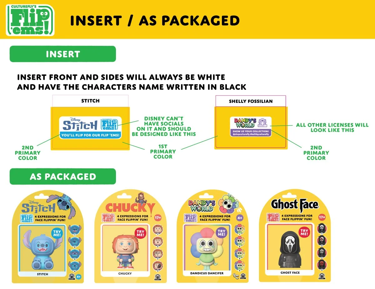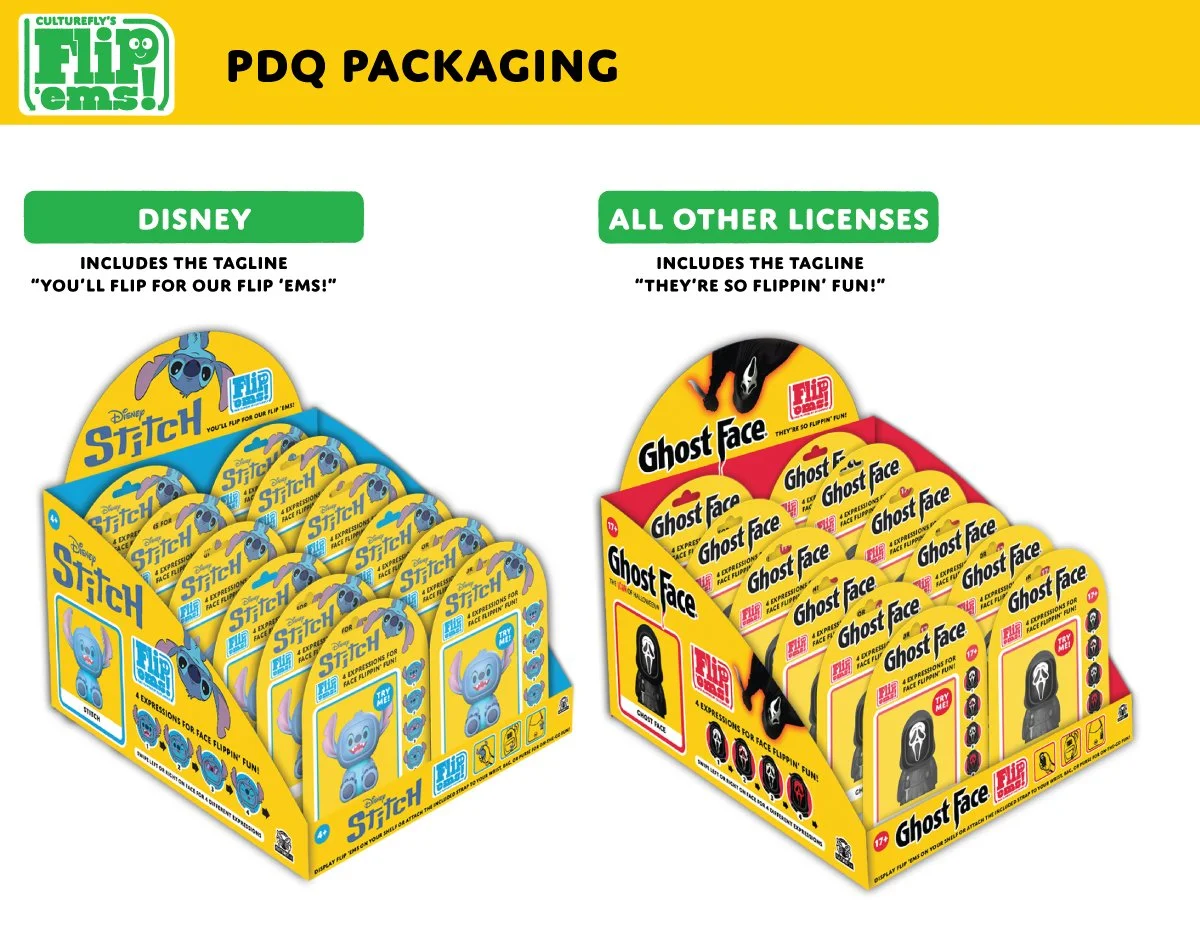 Before I joined, CultureFly packaging relied heavily on licensor assets, resulting in products that lacked a distinct brand identity. With Flip 'ems!, my goal was to establish a unique and cohesive look for CultureFly across the form factor. Introducing our own branding into licensed products was a new approach for many licensors, making the process particularly challenging, especially with Disney. To facilitate understanding and gain approval, I developed comprehensive brand guidelines and negotiated compromises that satisfied both parties. Today, Flip 'ems packaging is easy for anyone to design on brand and is often approved quickly by licensors.